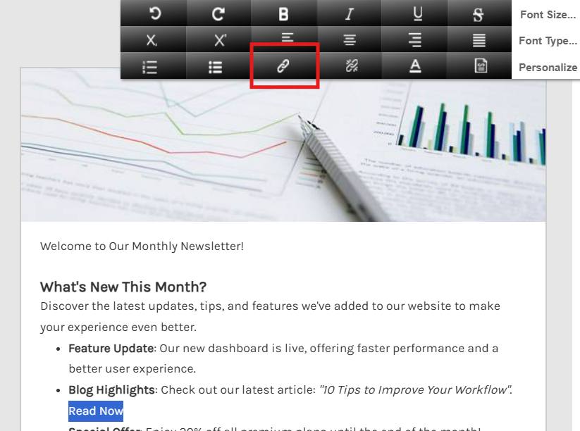 - To link an image or the email header, hover your mouse over the image or header. Click the "Link" icon visible in the top-right corner. In the popup that appears, fill in or paste the URL of the page you wish to link to and submit.