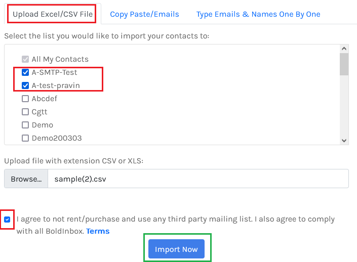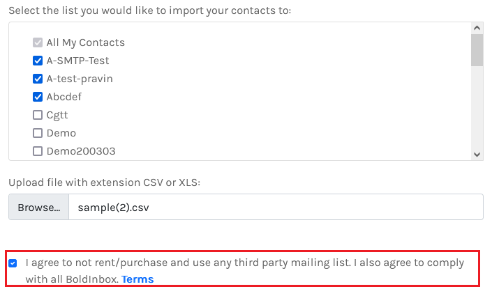 6) Once the file is selected from your computer, you can then select the list you want these contacts to be imported into and "agree" to the BoldInbox terms of use.